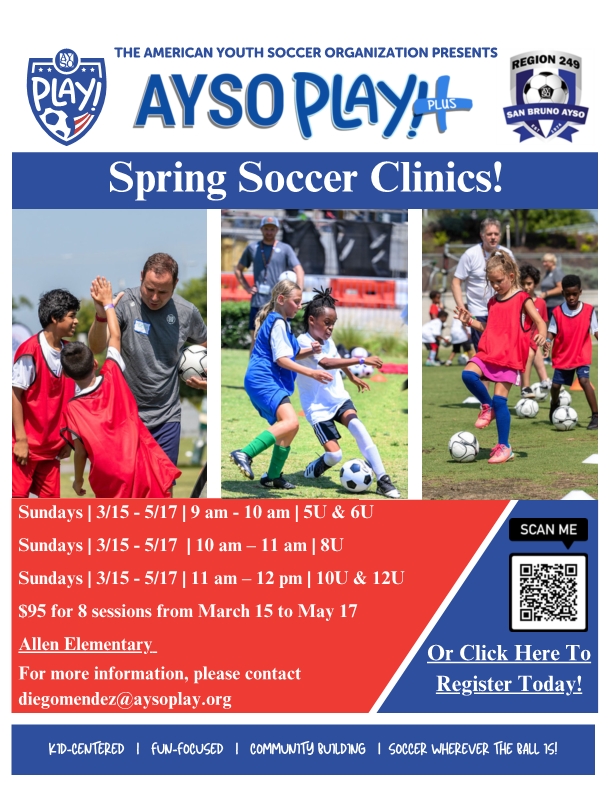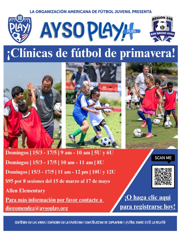 We’re excited to share that we are partnering with AYSO PLAY this spring to bring a fun, skills-focused soccer program to San Bruno for our 6U–12U players (ages 5–11 in 2025). Sessions will be held on Sunday mornings from March through May.